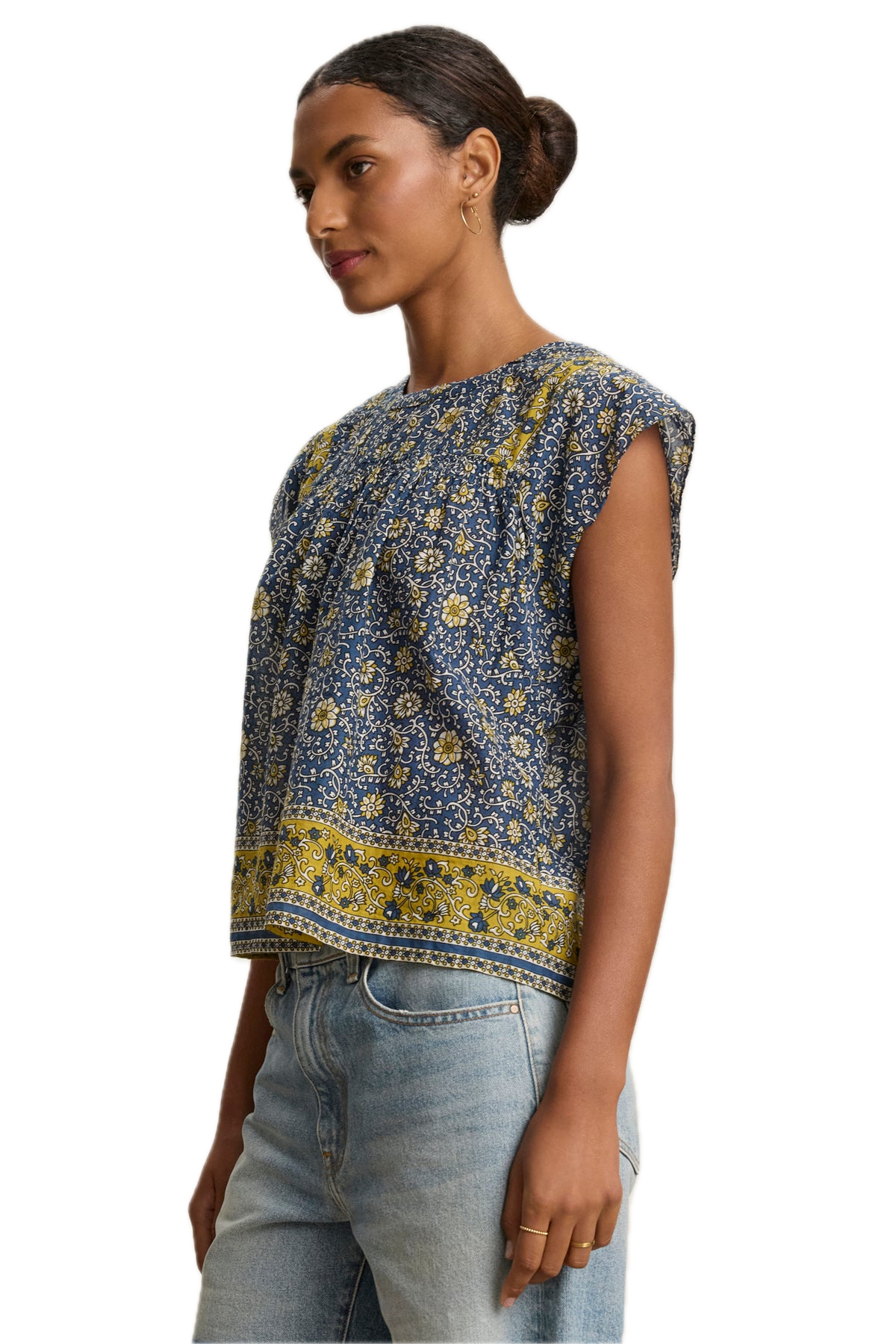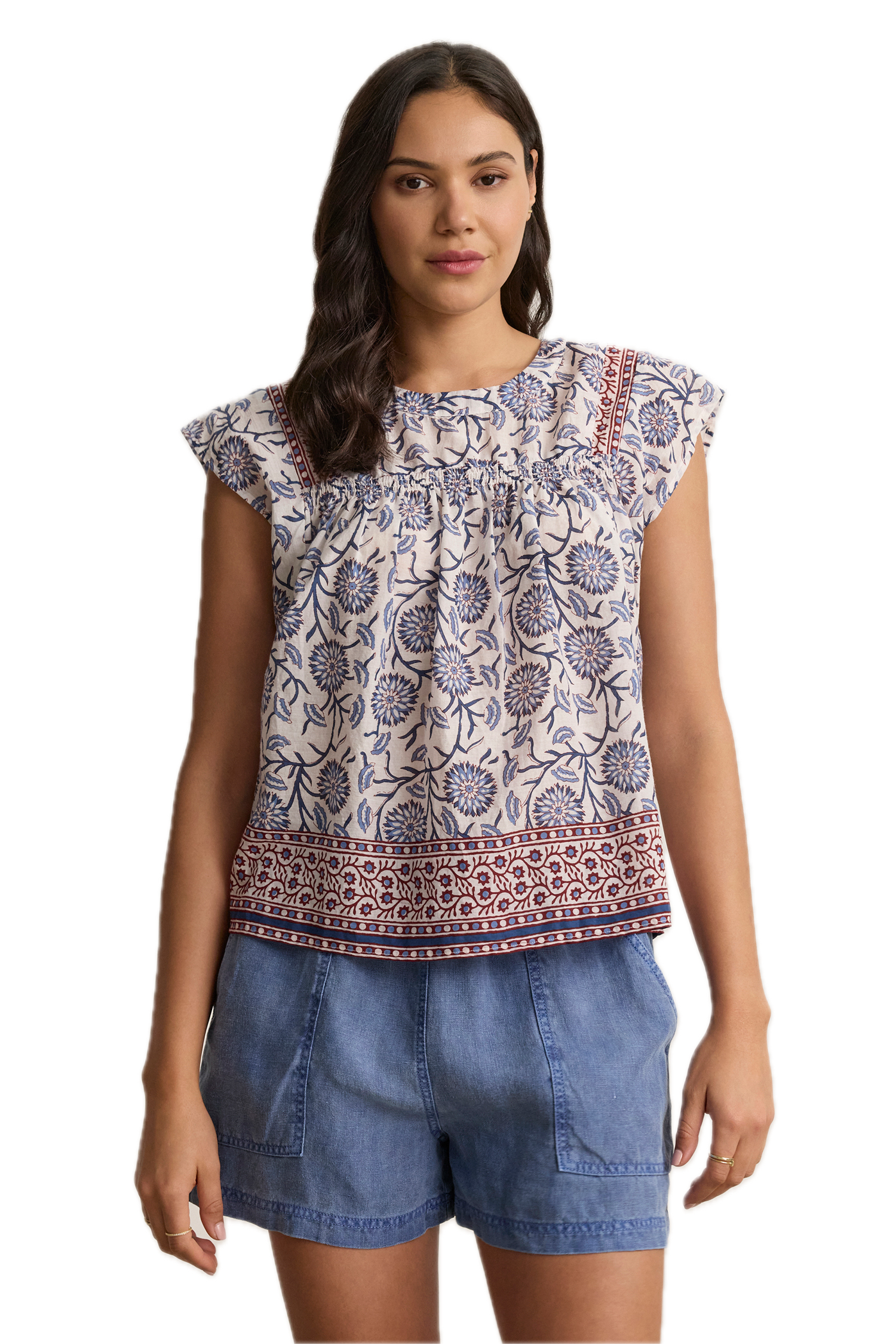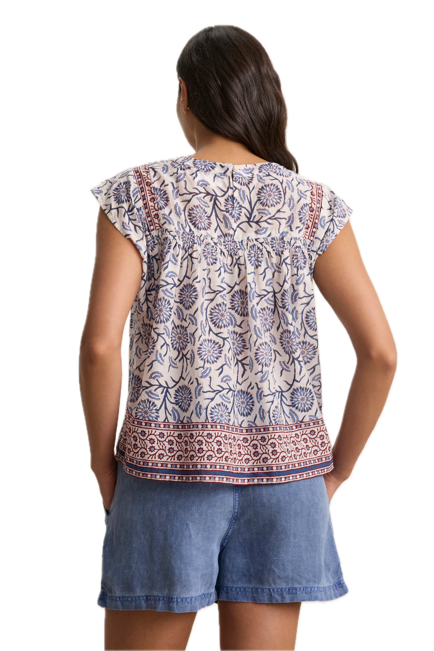 - Featuring a round neckline, capped sleeves, and a keyhole closure at the back, this top is crafted from light cotton with a distinctive block print.